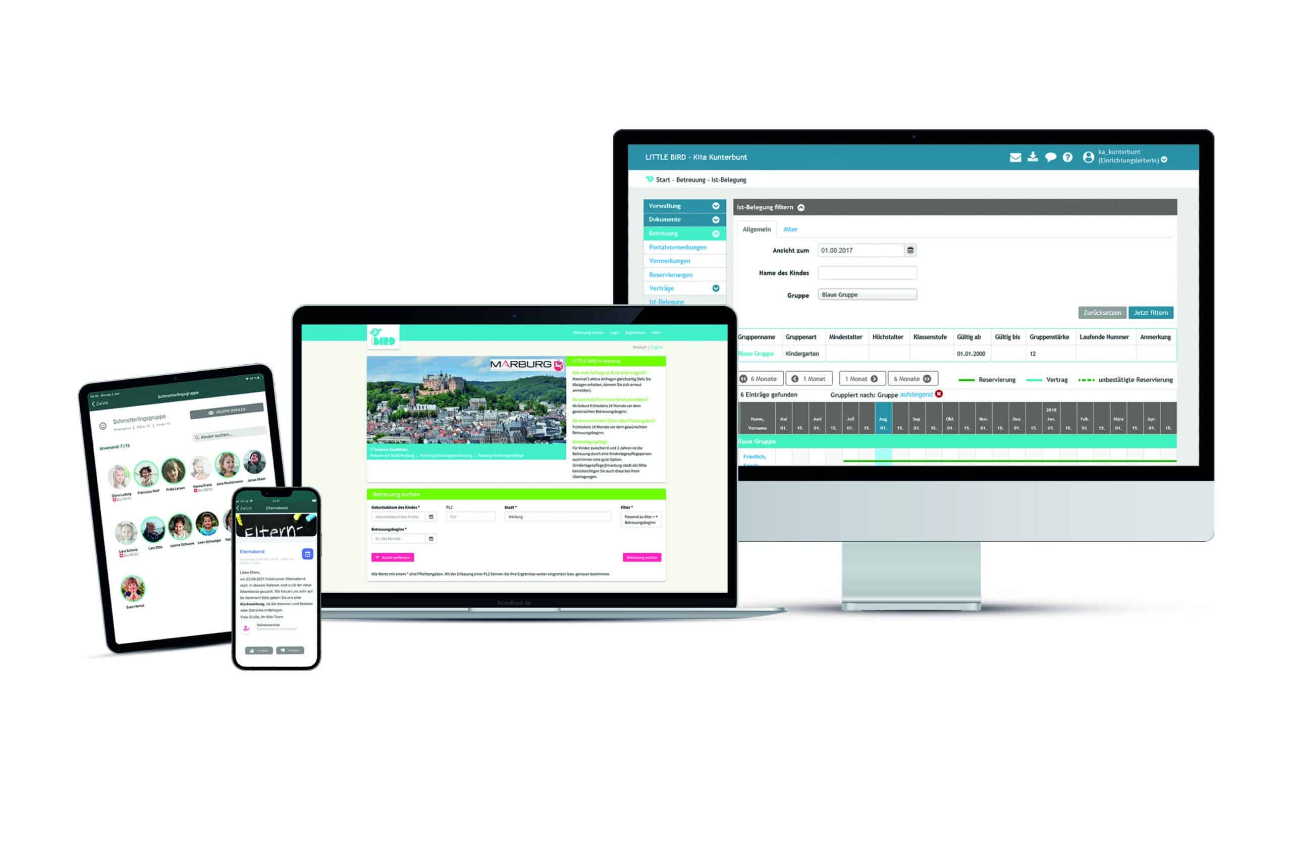 Die Gesamtlösung von LITTLE BIRD umfasst drei zentrale Anwendungen: Da ist zunächst das Elternportal, mit dem Mütter und Väter ganz einfach per Mausklick passende Betreuungsangebote finden und ihr Kind auch gleich anmelden können. Für den Landkreis, die Gemeinden und die Kinderbetreuungseinrichtungen gibt es die Verwaltungssoftware von LITTLE BIRD. Mit dieser Software werden unter anderem die Bedarfsplanung und das Vertragsmanagement sowie die Elternbeitragsabrechnung, die Dokumentation und der interkommunale Kostenausgleich effizient und übersichtlich. Als dritte Anwendung steht die Kita-App zur Verfügung. Damit können Kitas und andere Betreuungseinrichtungen zum Beispiel die Kommunikation mit den Eltern und die Gruppenarbeit vereinfachen.